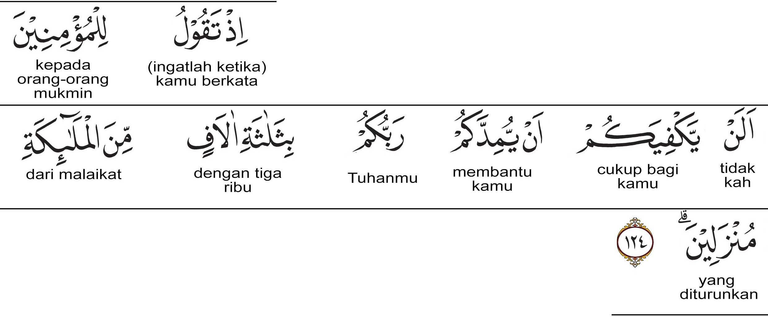 (Ingadali), ketika engkau (Nabi Muhammad saw.) mengatakan kepada orang orang mukmin: Apakah tidak akan cukup bagi kamu bahwa Tuhan Pemelihara kamu membantu kamu dengan tiga ribu malaikat yang diturunkan?”