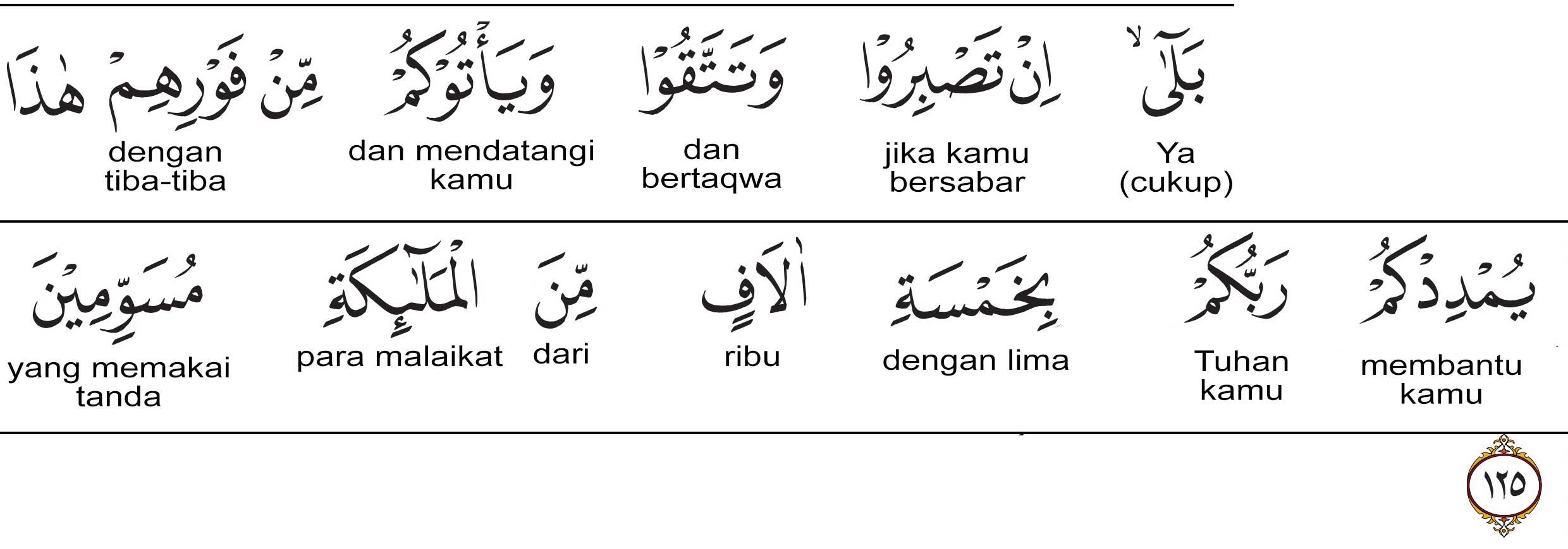 Kemenag RI 2019:“Ya (cukup).” Jika kamu bersabar dan bertakwa, lalu mereka datang menyerang kamu dengan tiba-tiba, niscaya Allah menolongmu dengan lima ribu malaikat yang memakai tanda. Prof. Quraish Shihab: