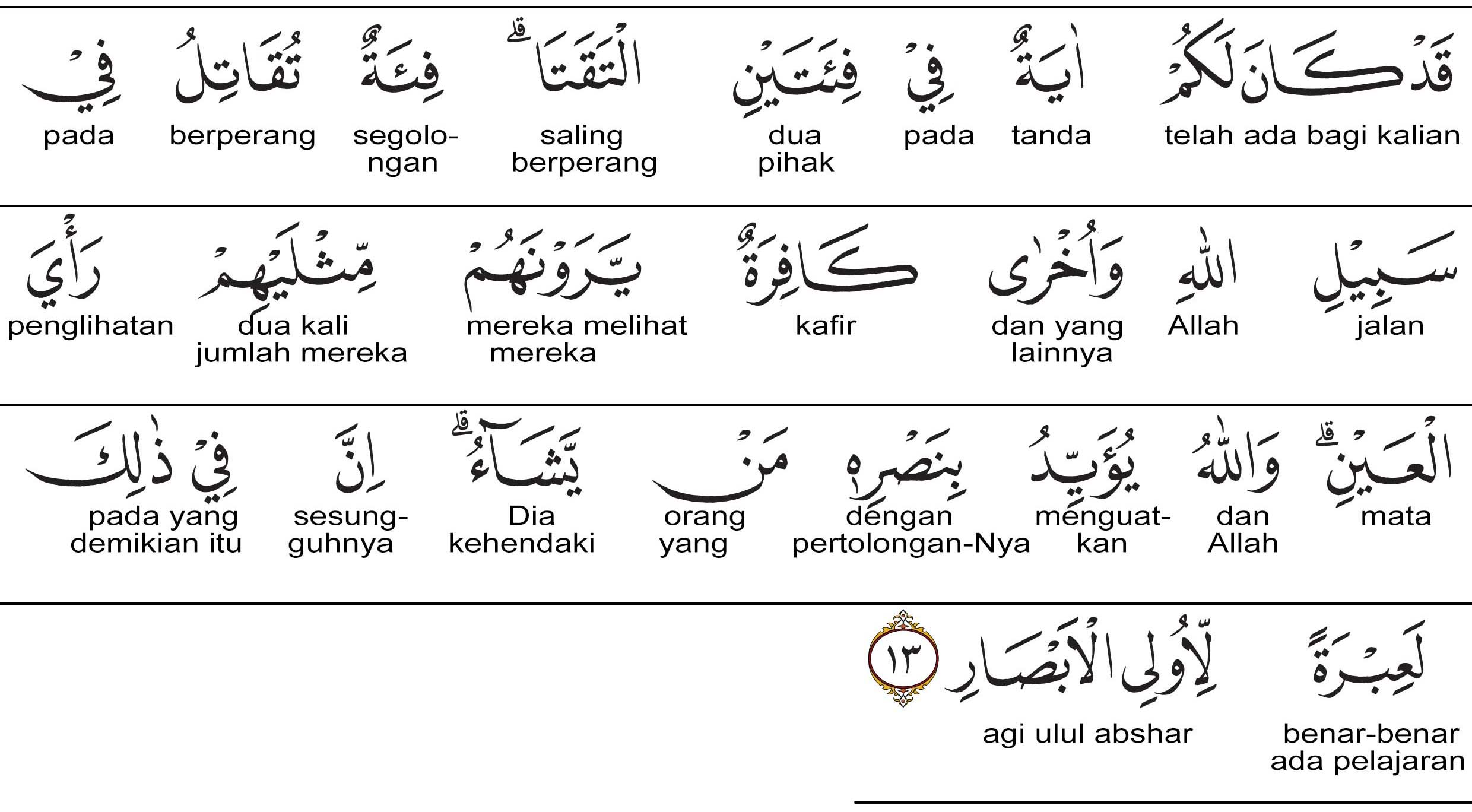 Sesungguhnya, telah ada bagi kamu suatu tanda pada dua golongan yang bertemu. Yang satu golongan berperang di jalan Allah dan yang lain adalah kafir. Mereka (yang berperang karena Allah) melihat kepada mereka (yang kafir) dengan penglihatan mata, dua kali sebanyak mereka. Padahal Allah menyokong dengan pertolongan-Nya siapa yang Dia kehendaki. Sesungguhnya, pada yang demikian itu adalah suatu ibarat bagi orang yang mempunyai pikiran.