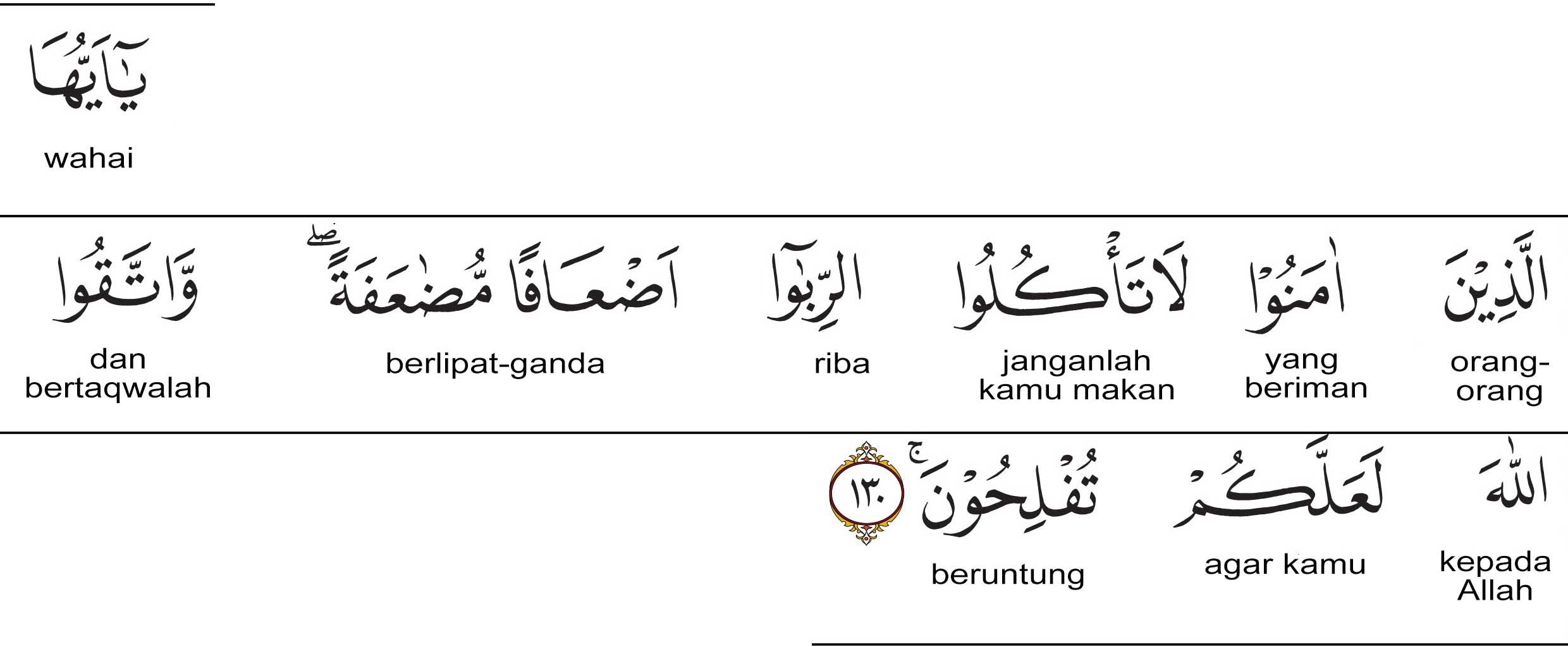 Wahai orang-orang yang beriman! Janganlah kamu memakan riba berlipat ganda. Dan takwalah kepada Allah, supaya kamu beroleh kemenangan