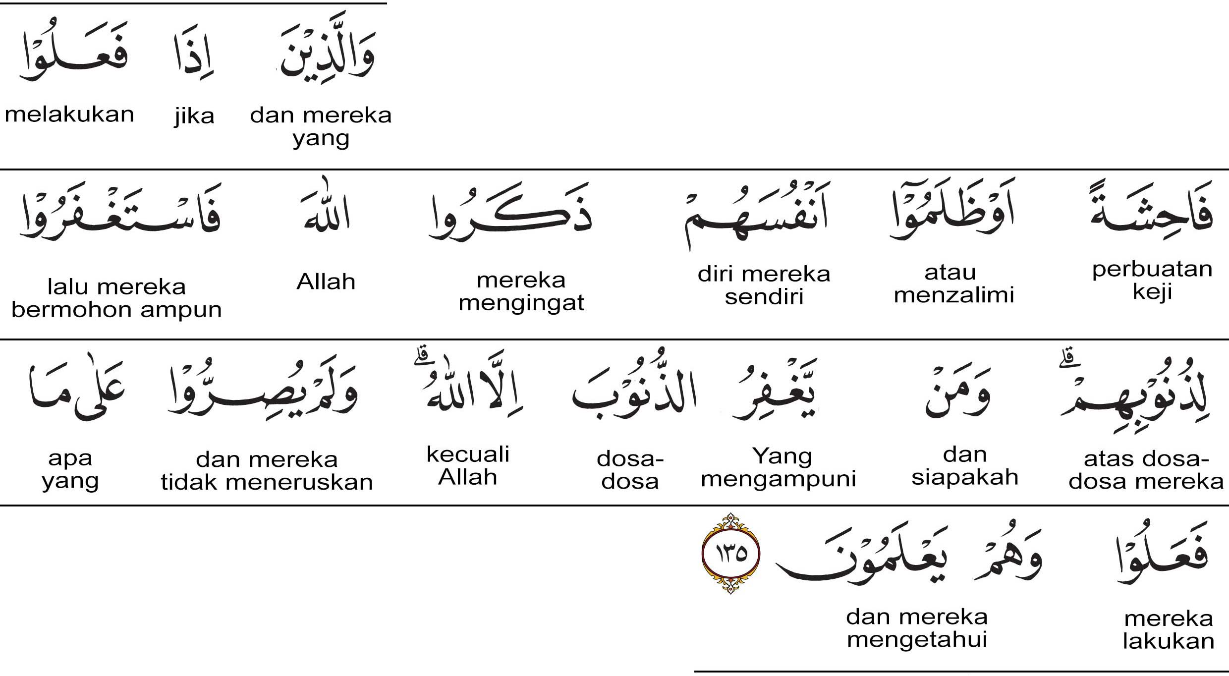 Dan orang-orang yang apabila pernah berbuat keji atau menganiaya diri mereka sendiri; lalu mereka ingat akan Allah, dan mereka pun memohon ampun dosa-dosa mereka. Padahal siapakah lagi yang akan mengampuni dosa-dosa kalau bukan Allah? Dan tidak mereka berketerusan atas apa yang pernah mereka kerjakan itu, padahal mereka mengetahui.