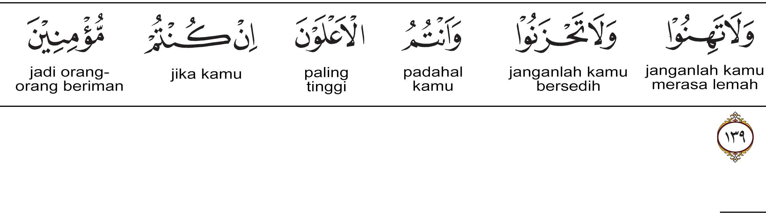 Lafazh wa antum (وَأَنْتُمُ) artinya dan kamu. Lafazh a’launa (الْأَعْلَوْنَ) artinya paling tinggi. Kata in kuntum (إِنْ كُنْتُمْ) artinya jika kamu lafazh mu’minin (مُؤْمِنِينَ) artinya : kamu orang-orang yang beriman.