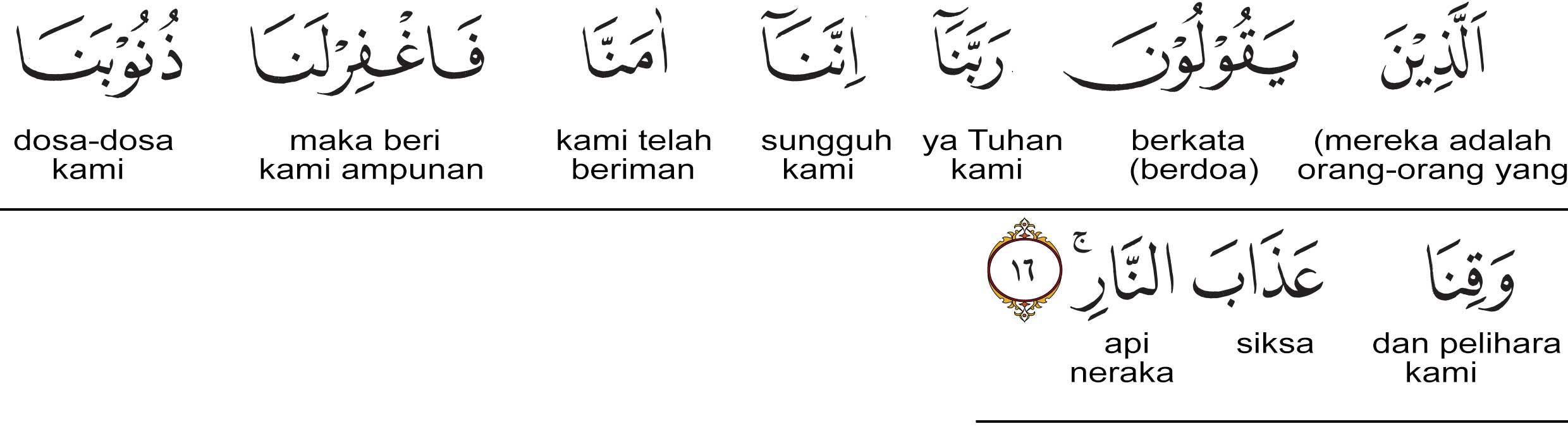 {Yaitu) orang-orang yang berkata, "Ya, Tuhan kami! Sesungguhnya, kami telah beriman. Oleh karena itu, ampunilah bagi kami dosadosa kami dan peliharakanlah kami dari siksaan neraka."