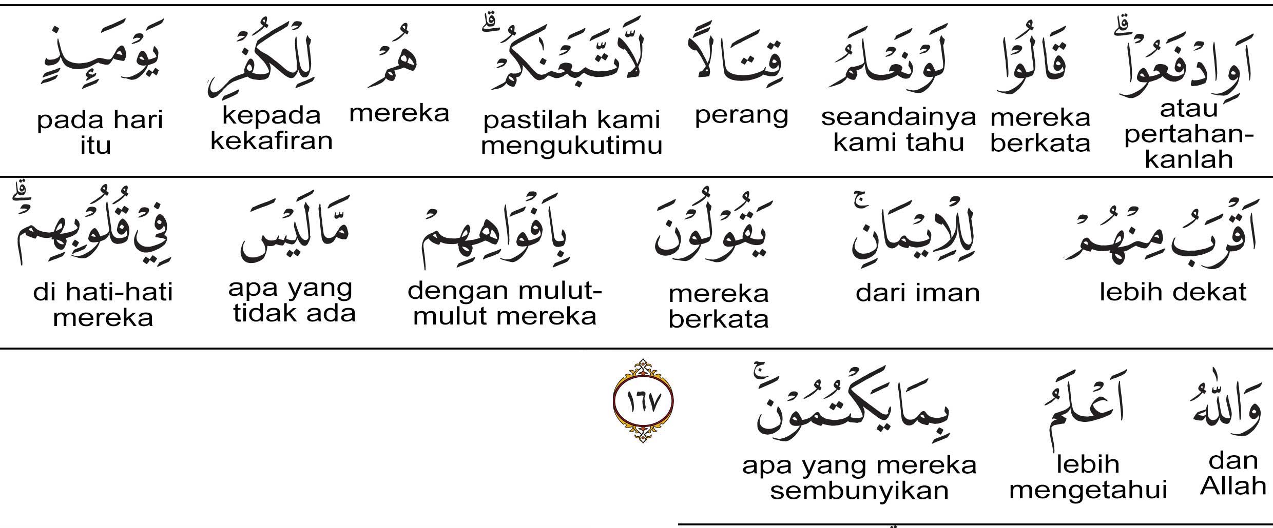 dan supaya Dia mengetahui siapa orang-orang yang munafik. Kepada mereka dikatakan: “Marilah berperang di jalan Allah atau pertahankanlah (diri, keluarga dan negeri kamu).’’ Mereka (orang-orang yang munafik) berkata: “Jika seandainya kami mengetahui (akan terjadi) peperangan, tentulah kami mengikuti kamu.” Mereka pada hari itu lebih dekat kepada kekafiran daripada keimanan. Mereka mengatakan dengan mulut mereka apa yang tidak terkandung dalam hati mereka. Dan Allah lebih mengetahui apa yang mereka sembunyikan.