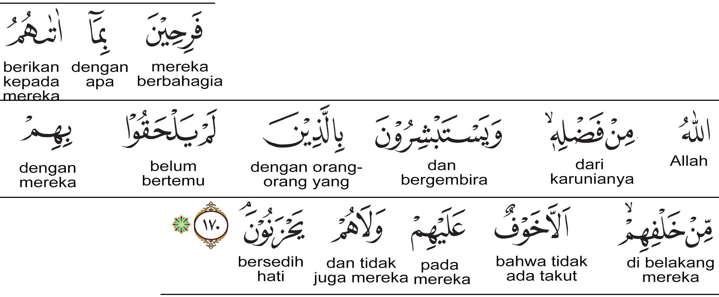 Kemenag RI 2019:Mereka bergembira dengan karunia yang Allah anugerahkan kepadanya dan bergirang hati atas (keadaan) orang-orang yang berada di belakang yang belum menyusul mereka, ) yaitu bahwa tidak ada rasa takut pada mereka dan mereka tidak bersedih hati. Prof. Quraish Shihab: