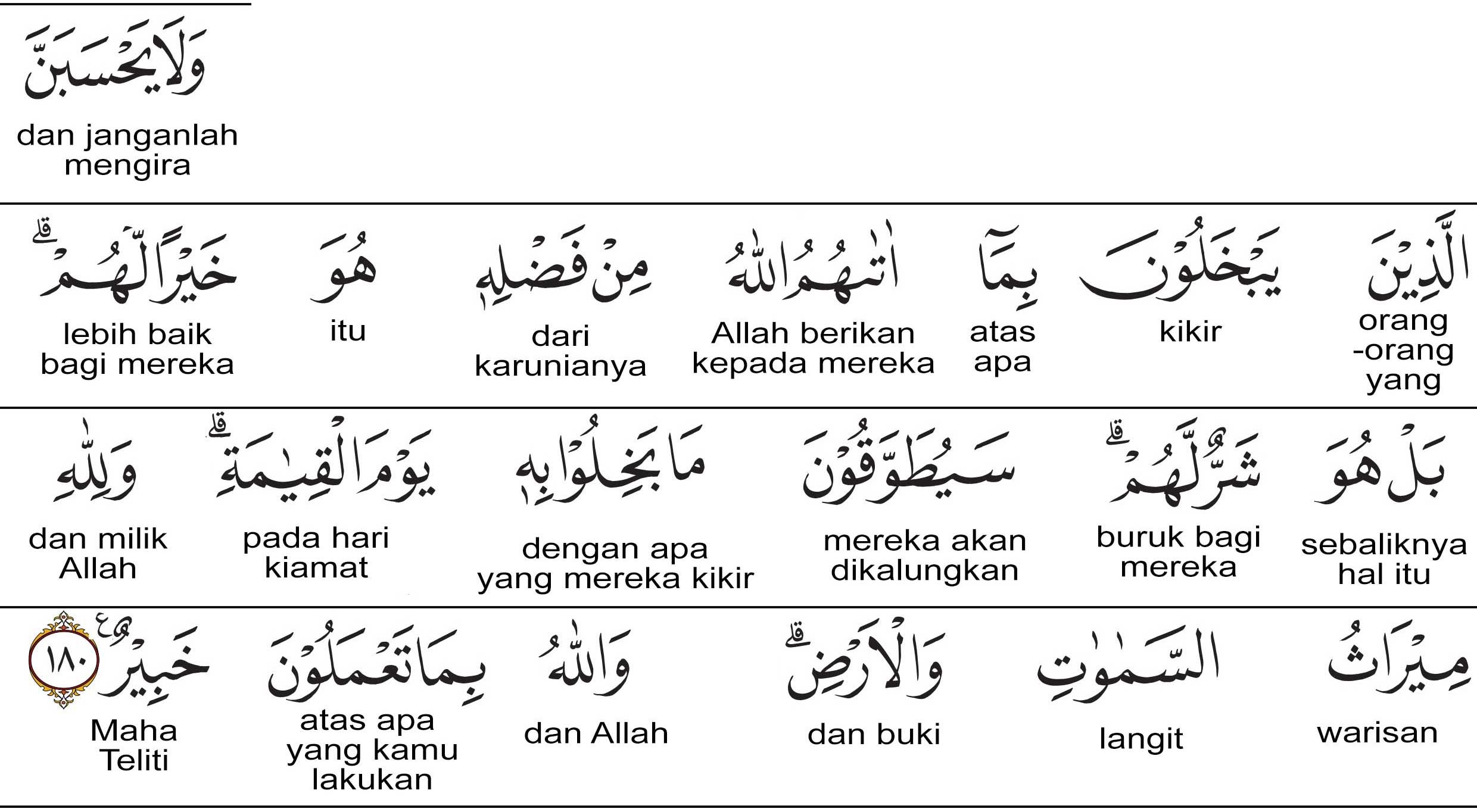 Janganlah sekali-kali orang-orang yang kikir dengan apa yang Allah anugerahkan kepada mereka dari karunia-Nya mengira bahwa ia (kekikiran itu) baik bagi mereka. Bahkan, ia buruk bagi mereka. Apa yang mereka kikirkan itu akan dikalungkan di (leher) mereka pada Hari Kiamat. Dan milik Allah segala warisan yang ada di langit dan di bumi. Dan Allah Mahateliti terhadap apa yang kamu kerjakan.
