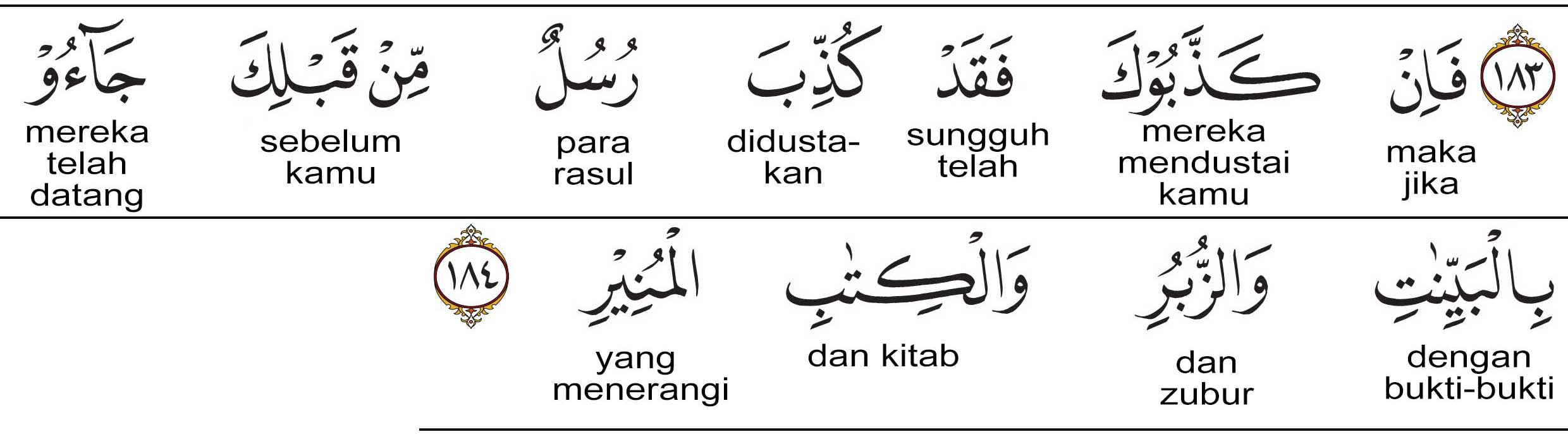 Maka,jikamerekamendustakanmu (Nabi Muhammad saw.), maka sungguh para rasul sebelummu (pun) telah didustakan (pula), mereka membawa keterangan-keterangan yang nyata, dan Zabur dan kitab yang memberi penjelasan yang sempurna.