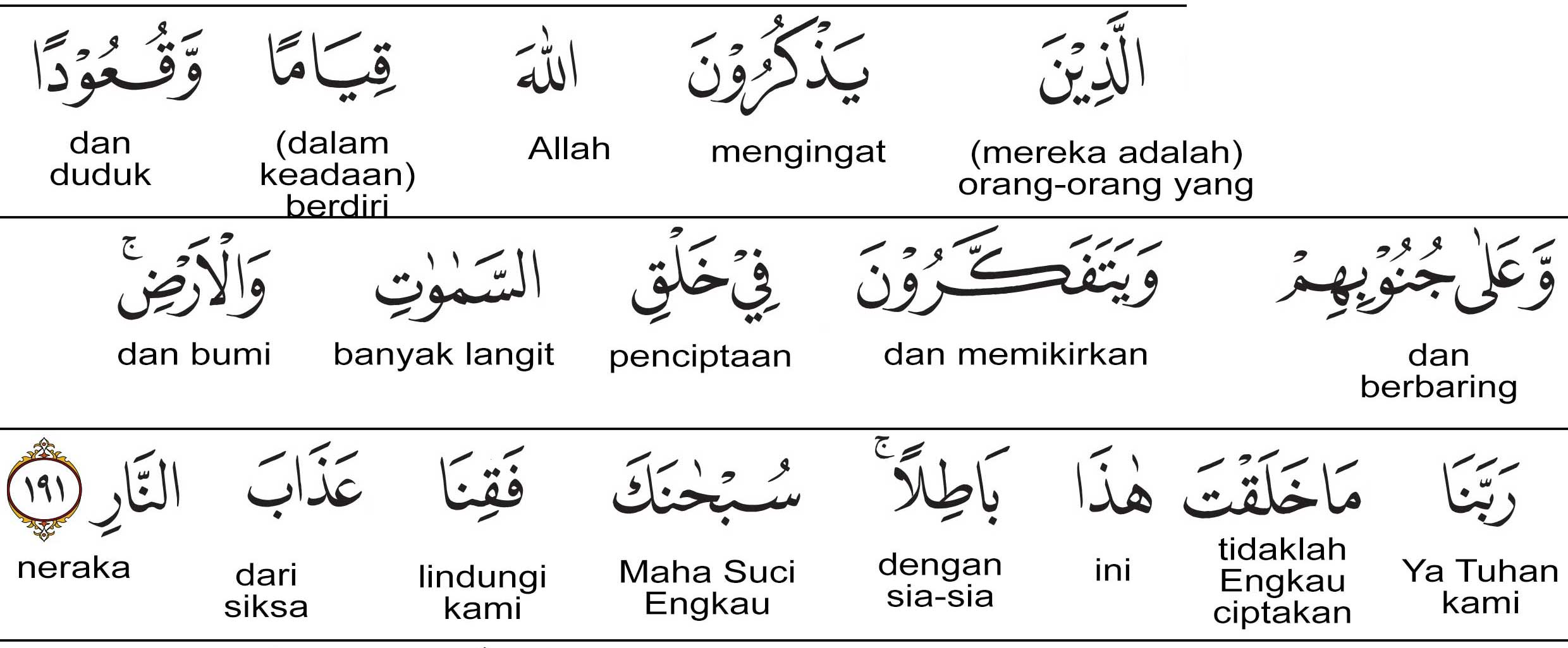 (Yaitu) orang-orang yang mengingat Allah dalam keadaan berdiri atau duduk atau berbaring dan mereka memikirkan tentang penciptaan langit dan bumi: “Tuhan Pemelihara kami, tidaklah Engkau menciptakan ini dengan sia-sia. Mahasuci Engkau, maka peliharalah kami dari azab neraka.