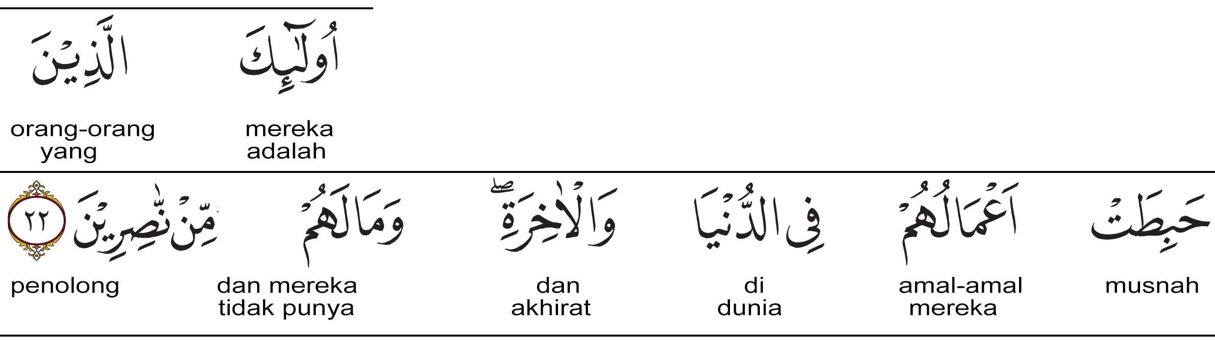 Lafazh ulaikalladzina (أُولَٰئِكَ الَّذِينَ) artinya : mereka itulah orang-orang yang, habithath a’maluhum (حَبِطَتْ أَعْمَالُهُمْ) artinya : sia-sia dan percuma amal-amalnya.