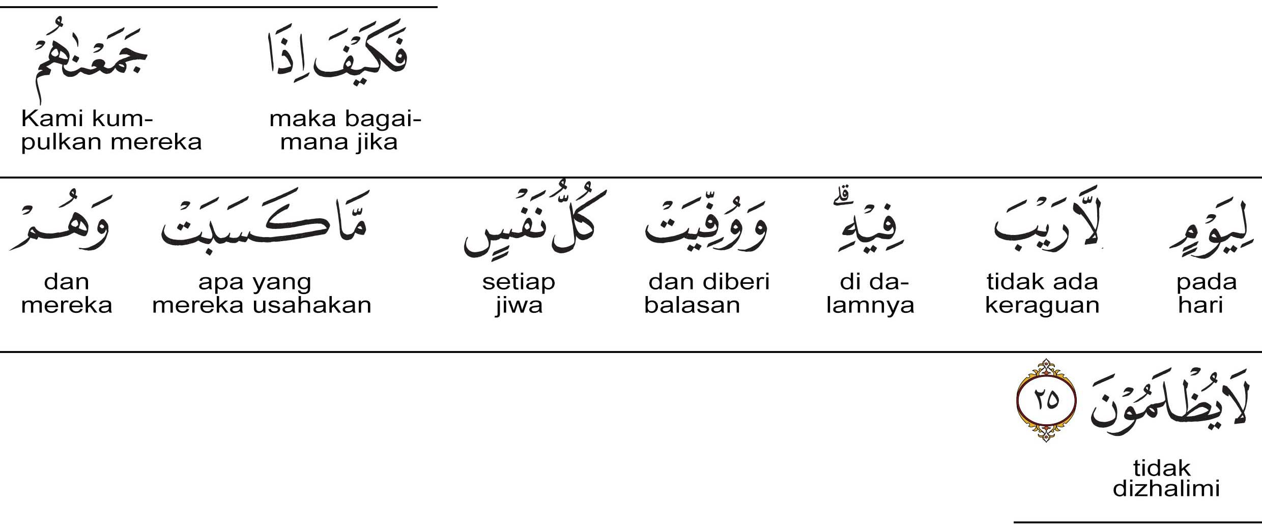 Bagaimanakah apabila mereka Kami kumpulkan pada hari (Kiamat) yang tidak ada keraguan padanya? Dan setiap diri akan diberi (pahalanya) dengan cukup atas apa yang telah diusahakan(nya), sedangkan mereka (sedikitpun) tidak dianiaya (dirugikan).