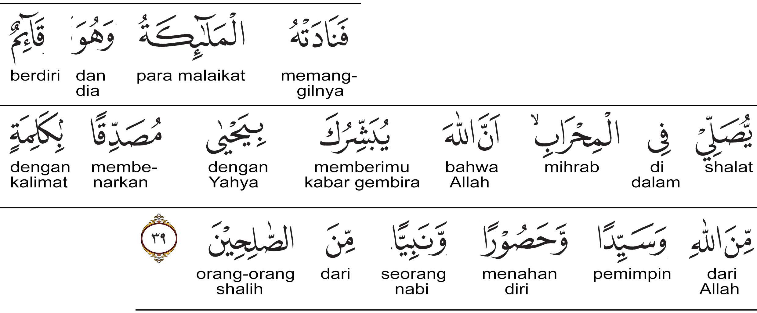 "Maka para malaikat memanggilnya ketika dia sedang berdiri melakukan shalat di mihrab. (Katanya): ''Sesungguhnya Allah menggembirakan kamu dengan kelahiran Yab_ya, Pembenar kalimat Allah, panutan, berkemampuan menahan diri, dan seorang nabi yang termasuk kelompok orang-orang saleh. "