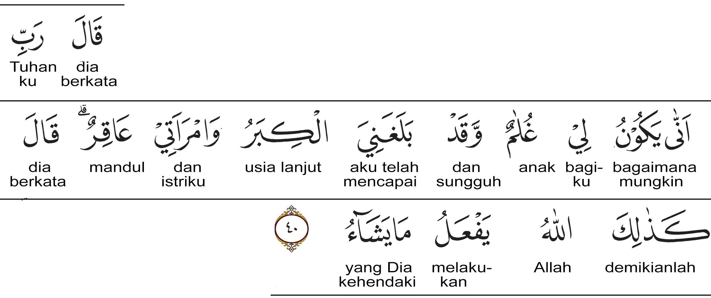 Ayat ke-40 ini menceritakan tentang ungkapan rasa penasaran Nabi Zakaria yang diberi kabar gembira akan punya anak di usia lanjut. Digambarkan Zakaria bertanya bagaimana caranya dirinya bisa diberi anak? Padahal usianya sudah tidak lagi muda dan istrinya pun mandul.