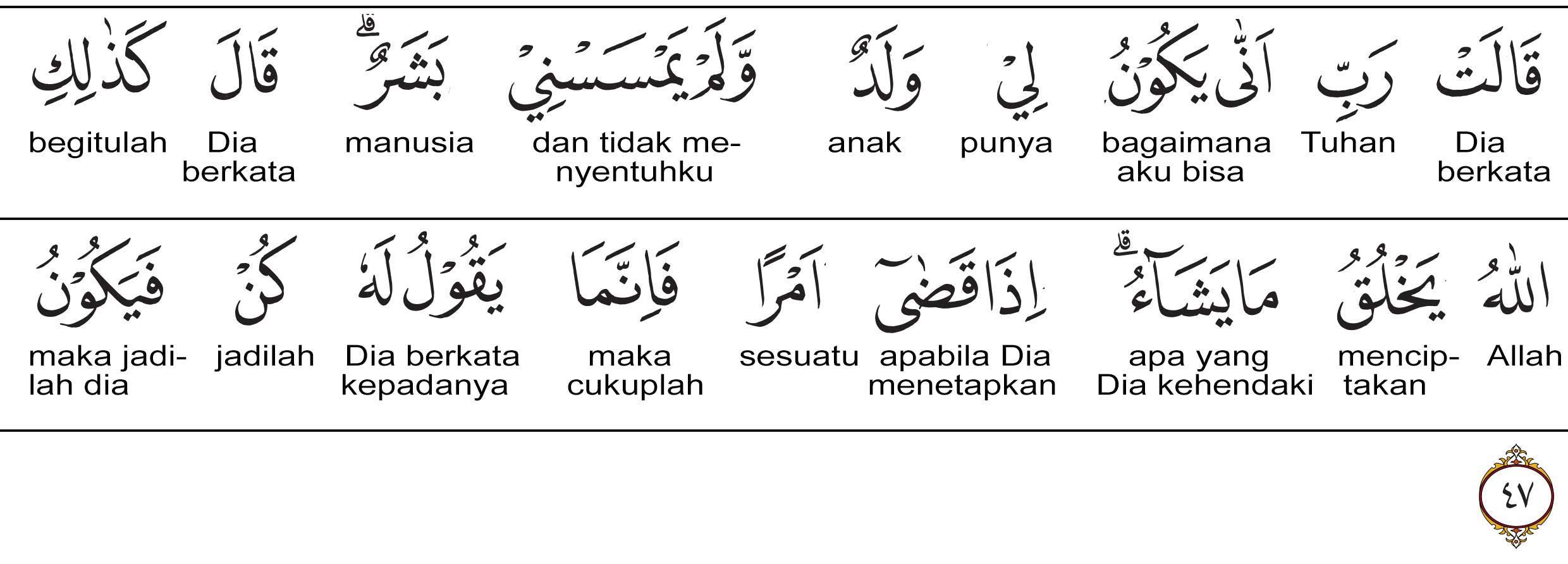 Maryam berkata: 'Tuhanku, bagaimana bisa aku mempunyai anak, padahal aku belum pernah disentuh oleh seorang laki-laki pun. " Allah berfirman: ''Demikianlah, Allah mencipta apa yang dikehendaki-Nya. Apabila Dia menetapkan suatu urusan, maka Dia berfirman kepadanya: Jadilah!' Maka terjadilah ia. "