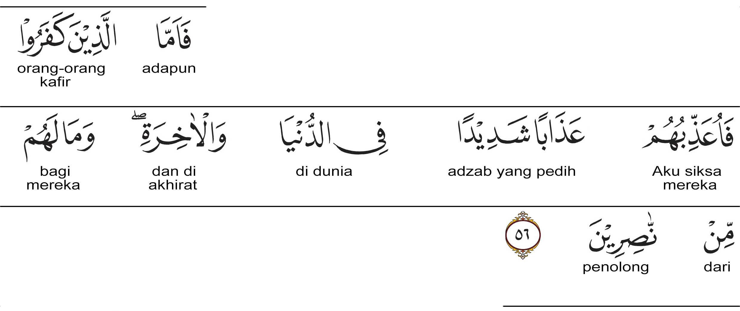 Maka, adapun orang-orang yang kafir itu maka akan Aku siksalah rnereka dengan siksaan yang sangat di dunia dan di akhirat. Dan, tidaklah ada bagi mereka orang-orang yang akan menolong.
