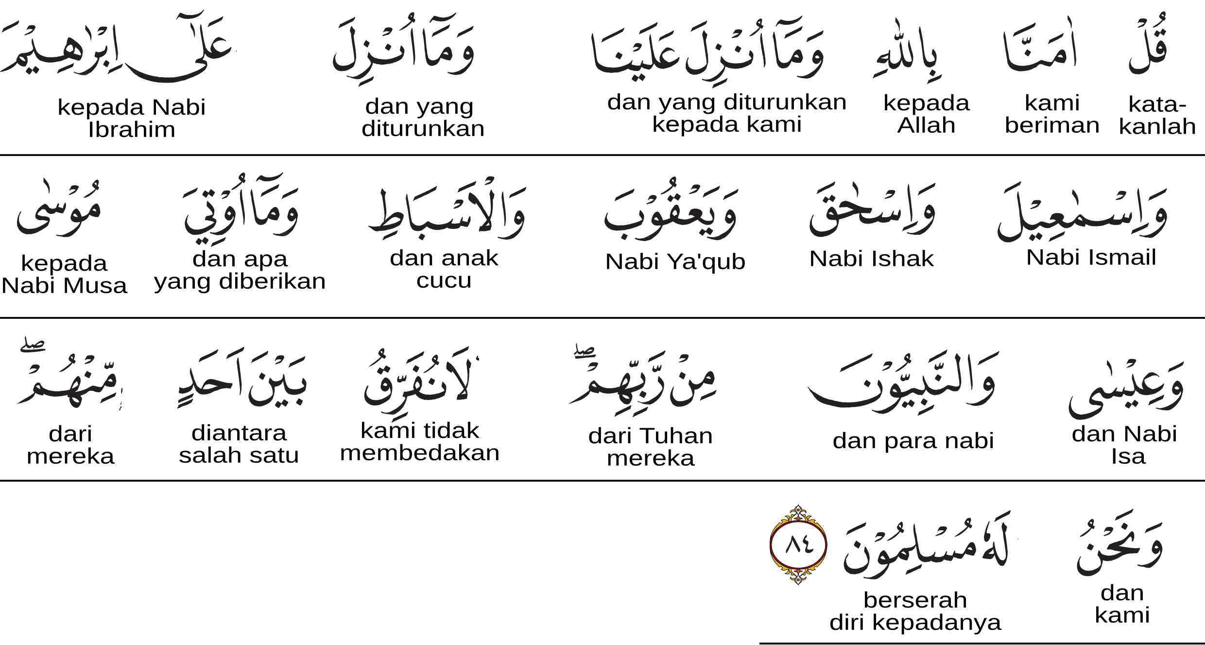 Katakanlah: ''Kami beriman kepada Allah dan kepada apa yang diturunkan atas kami dan yang diturunkan kepada Ibrahim, Ismail dan Ishaq serta Ya'qub, dan anak-anaknya, dan apa yang diberikan kepada Musa, dan para nabi dari Tuhan mereka. Kami tidak membeda-bedakan seorang pun di antara mereka dan hanya kepada-Nya-lah kami menyerahkan diri. "