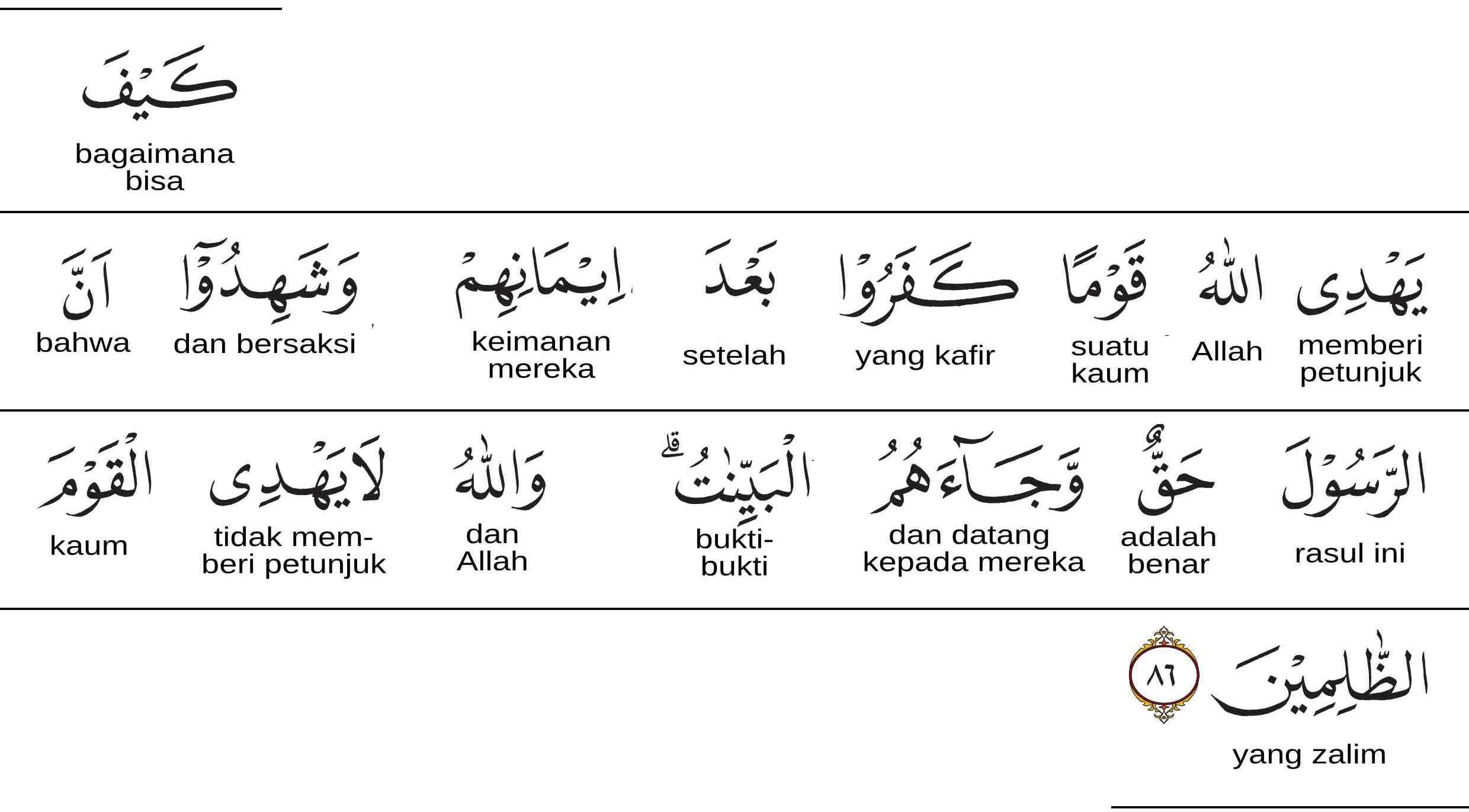 Bagaimana Allah akan memberi petunjuk kepada suatu kaum yang kafir sesudah mereka beriman, serta mereka telah mengakui bahwa Rasul itu (Muhammad) benar-benar rasul dan keterangan-keterangan pun telah datang kepada mereka? Allah tidak memberi petunjuk kepada orang-orangyang zalim. "