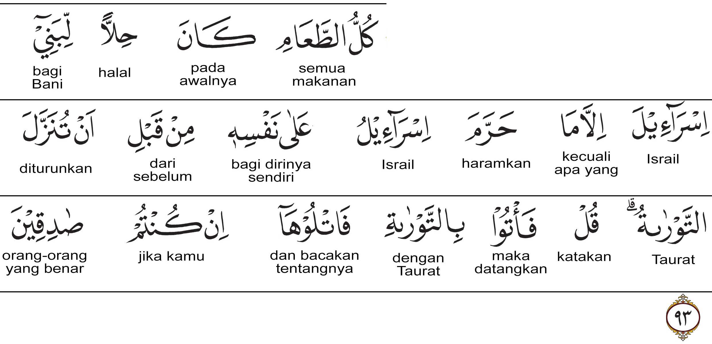 Kemenag RI 2019: Semua makanan halal bagi Bani Israil, kecuali makanan yang diharamkan oleh Israil (Ya‘qub) atas dirinya sebelum Taurat diturunkan. ) Katakanlah (Nabi Muhammad), “Bawalah Taurat lalu bacalah, jika kamu orang-orang yang benar.”| TAFSIR AL-MAHFUZH | REFERENSI KITAB TAFSIR |