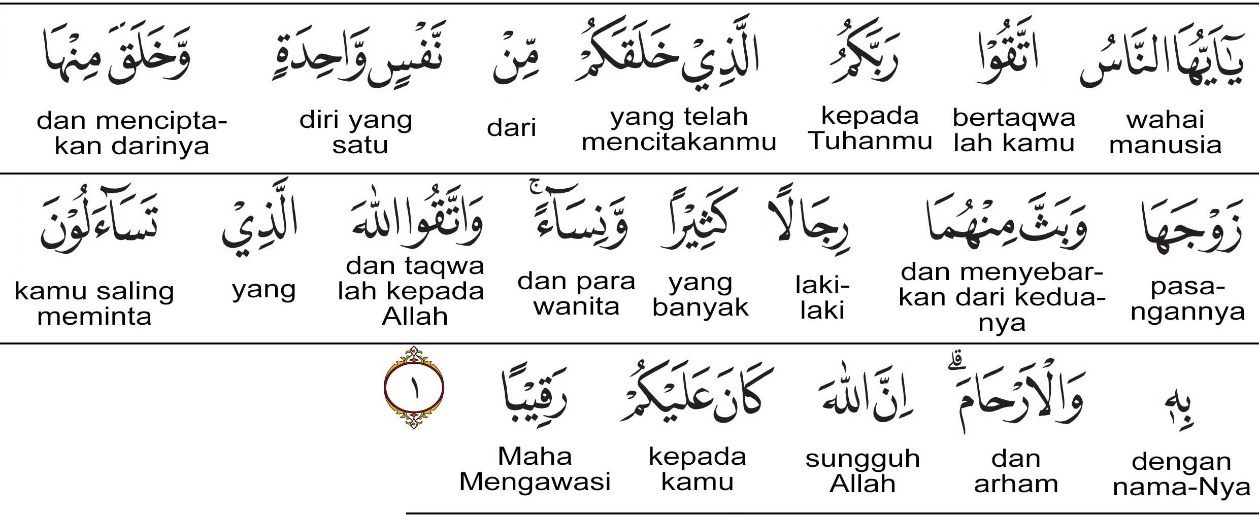 Hai sekalian manusia! Bertakwalah kamu kepada Tuhanmu, yang telah menjadikan kamu dari satu diri, dan daripadanya dijadikan-Nya istrinya serta dari keduanya Dia memperkembangbiakkan laki-laki dan perempuan yang banyak. Bertakwalah kepada Allah, yang kamu telah tanya-bertanya tentang (nama)-Nya, dan (peliharalah) kekeluargaan. Sesungguhnya Allah Pengawas atas kamu.