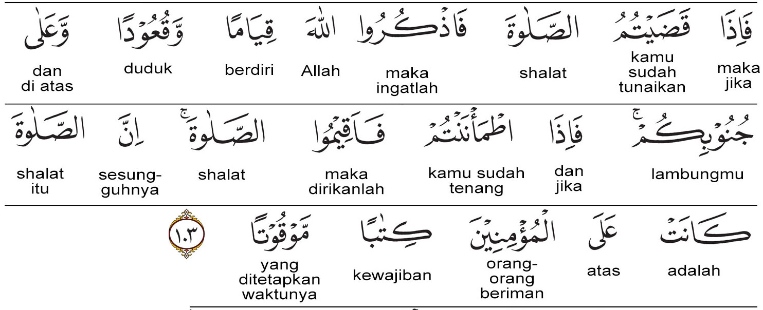 Kemenag RI 2019: Apabila kamu telah menyelesaikan salat, berzikirlah kepada Allah (mengingat dan menyebut-Nya), baik ketika kamu berdiri, duduk, maupun berbaring. Apabila kamu telah merasa aman, laksanakanlah salat itu (dengan sempurna). Sesungguhnya salat itu merupakan kewajiban yang waktunya telah ditentukan atas orang-orang mukmin.| TAFSIR AL-MAHFUZH | REFERENSI KITAB TAFSIR |