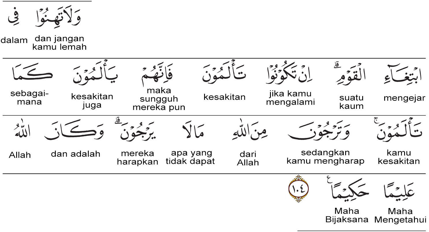 Kemenag RI 2019:Janganlah kamu merasa lemah dalam mengejar kaum itu (musuhmu). Jika kamu menderita kesakitan, sesungguhnya mereka pun menderita kesakitan sebagaimana yang kamu rasakan. (Bahkan) kamu dapat mengharapkan dari Allah apa yang tidak dapat mereka harapkan. Allah Maha Mengetahui lagi Maha Bijaksana. Prof. Quraish Shihab:Dan janganlah kamu berhati lemah dalam mengejar mereka (musuh-musuh kamu). Jika kamu kesakitan, maka sesungguhnya mereka juga menderita kesakitan sebagaimana kamu, sedangkan kamu mengharap dari Allah apa yang tidak mereka harapkan. Dan adalah Allah Maha Mengetahui, lagi Maha Bijaksana. Prof. HAMKA: Dan janganlah kamu lengah dalam mengejar kaum itu. Jika kamu menderita sakit, maka sesungguhnya mereka pun menderita sakit pula sebagaimana yang kamu derita. Sedang kamu mengharapkan dari Allah, hal yang tidak mereka harapkan. Dan adalah Allah itu Maha Mengetahui, lagi Bijaksana.