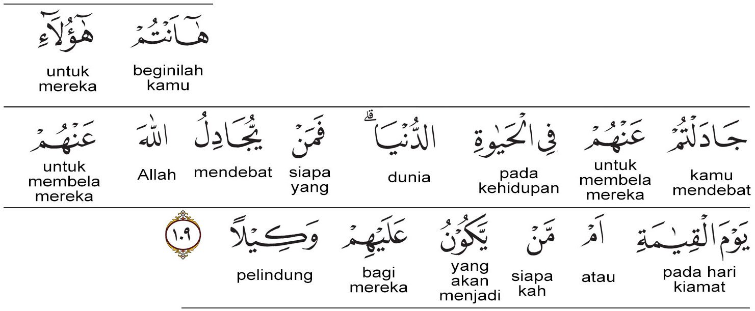 Kemenag RI 2019:Begitulah kamu. Kamu berdebat untuk (membela) mereka dalam kehidupan dunia ini. Akan tetapi, siapa yang akan menentang Allah untuk (membela) mereka pada hari Kiamat? Atau, siapakah yang menjadi pelindung mereka (dari azab Allah)? Prof. Quraish Shihab:Hai, beginilah kamu! Kamu telah berdebat untuk (membela) mereka di kehidupan dunia (ini). Maka, siapakah yang akan mendebat Allah untuk mereka pada Hari Kiamat? Atau siapakah yang menjadi pelindung mereka? Prof. HAMKA:Ha! Itulah kamu, orang-orang yang telah membela mereka dalam kehidupan dunia. Maka siapakah yang akan membela mereka di hari Kiamat? Atau siapakah yang akan menjadi pengurus atas mereka?