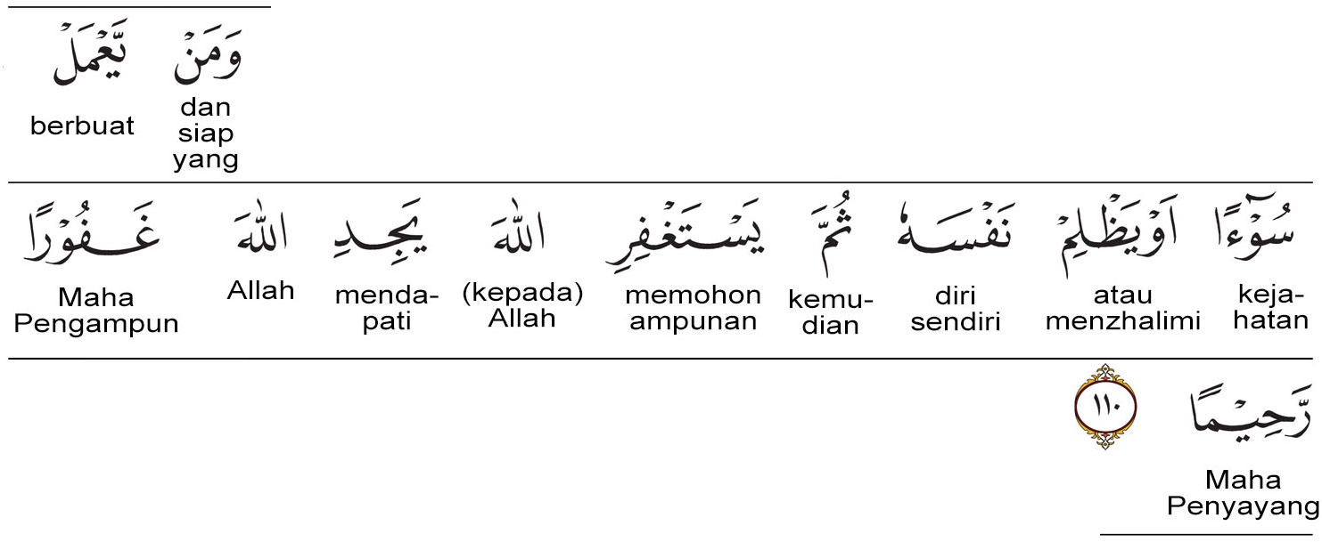 Kemenag RI 2019: Siapa yang berbuat kejahatan atau menganiaya dirinya, kemudian memohon ampunan kepada Allah, niscaya akan mendapati Allah Maha Pengampun lagi Maha Penyayang.