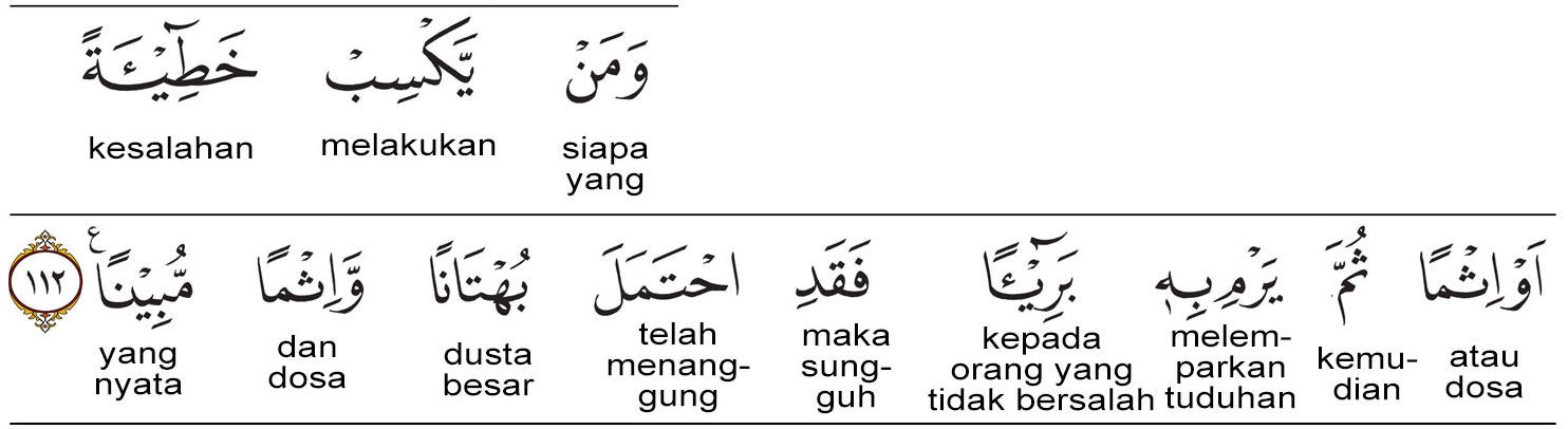 وَمَنْ يَكْسِبْ خَطِيئَةً أَوْ إِثْمًا ثُمَّ يَرْمِ بِهِ بَرِيئًا فَقَدِ احْتَمَلَ بُهْتَانًا وَإِثْمًا مُبِينًا