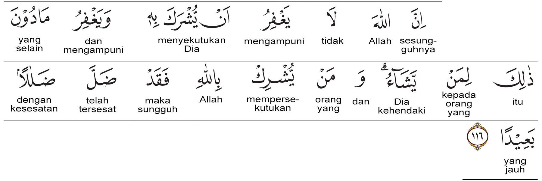 Kata wa man (وَمَنْ) artinya : siapa pun yang. Kata yusyrik (يُشْرِكْ) artinya : mempersekutukan. Kata billahi (بِاللَّهِ) artinya : Allah. Kata fa qad (فَقَدْ) artinya : maka sungguh. Kata dhalla (ضَلَّ) artinya : telah tersesat. Kata dhalalan (ضَلَالًا) artinya : ketersesatan. Kata ba’ida (بَعِيدًا) artinya : yang jauh.