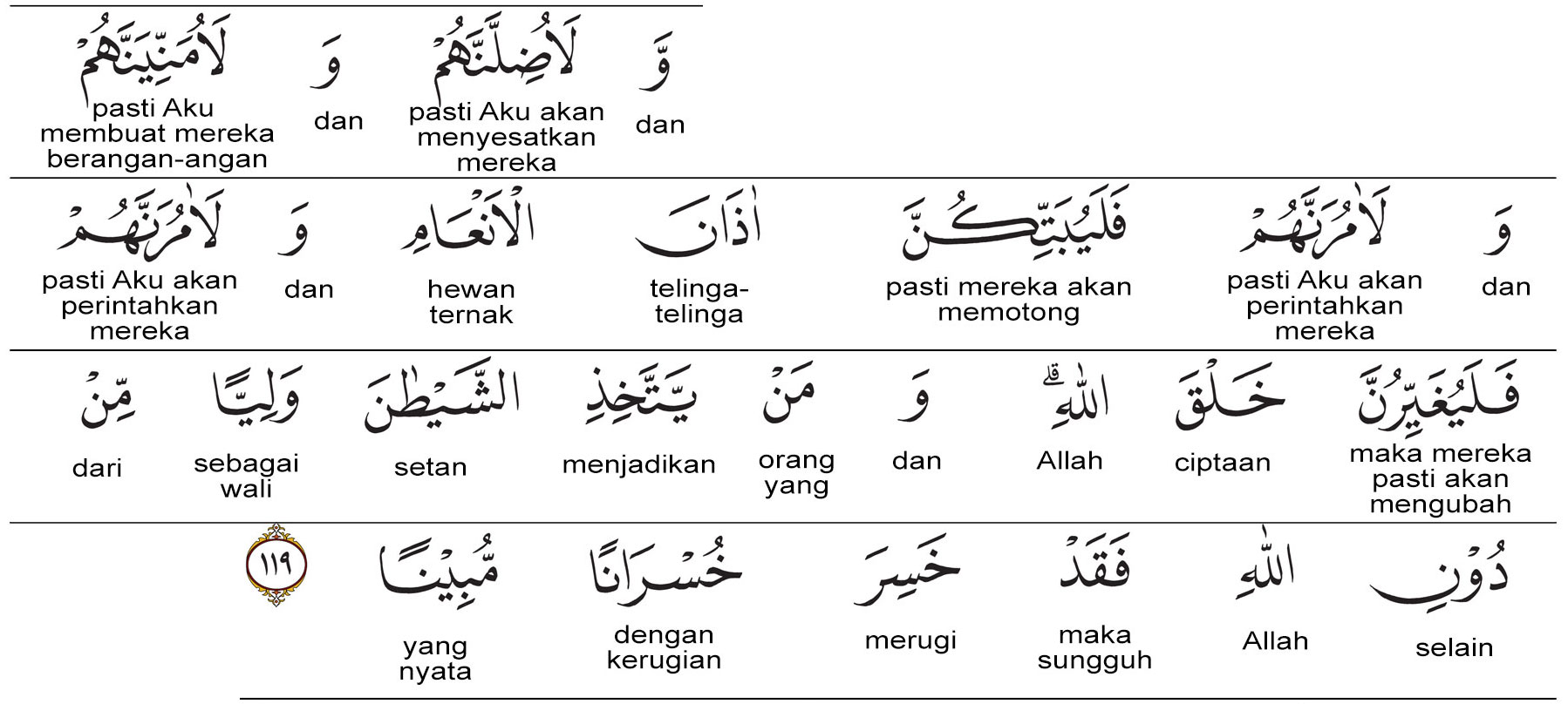 Kemenag RI 2019:Aku benar-benar akan menyesatkan mereka, membangkitkan angan-angan kosong mereka, menyuruh mereka (untuk memotong telinga-telinga binatang ternaknya) hingga mereka benar-benar memotongnya, ) dan menyuruh mereka (mengubah ciptaan Allah) hingga benar-benar mengubahnya.” ) Siapa yang menjadikan setan sebagai pelindung selain Allah sungguh telah menderita kerugian yang nyata. Prof. Quraish Shihab:Dan aku benar-benar akan menyesatkan mereka, dan aku benar-benar akan membangkitkan angan-angan kosong pada mereka dan aku benar-benar akan menyuruh mereka (memotong telinga-telinga binatang ternak), lalu mereka benar-benar memotongnya, dan aku benar-benar akan menyuruh mereka (mengubah ciptaan Allah swt.), lalu mereka benar-benar mengubah ciptaan Allah itu.” Barang siapa menjadikan setan sebagai pelindung selain Allah, maka sungguh dia menderita kerugian yang nyata. Prof. HAMKA:Dan sesungguhnya aku akan menyesatkan mereka, dan sungguh aku akan menjanjikan kepada mereka angan-angan, dan aku akan memerintah mereka, sehingga mereka memotong telinga binatang ternak, dan sungguh aku akan memerintah mereka hingga mereka mengubah perbuatan Allah. Dan barangsiapa yang mengambil setan sebagai pelindung selain Allah, sesungguhnya dia telah rugi, rugi yang nyata sekali.