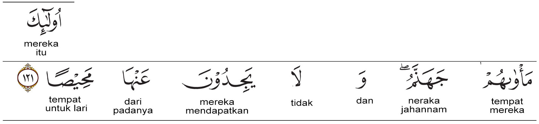 Kata wa laa (وَلَا) artinya : dan tidak. Kata yajiduna (يَجِدُونَ) artinya : menemukan. Kata ‘anha (عَنْهَا) artinya : dari padanya. Kata mahisha (مَحِيصًا) artinya : tempat untuk lari.