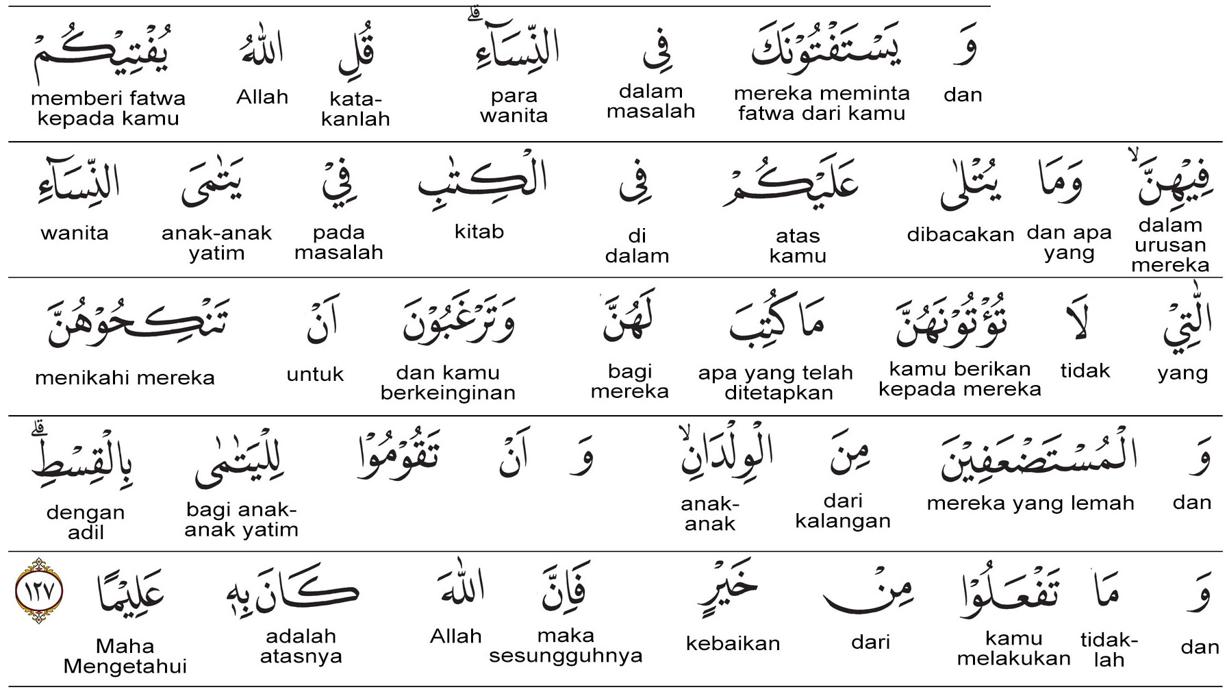 Kemenag RI 2019: Mereka meminta fatwa kepada engkau (Nabi Muhammad) tentang perempuan. Katakanlah, “Allah memberi fatwa kepadamu tentang mereka, ) dan apa yang dibacakan kepadamu dalam Al-Qur’an tentang para perempuan yatim yang tidak kamu berikan sesuatu (maskawin) yang ditetapkan untuk mereka, sedangkan kamu ingin menikahi mereka, ) serta (tentang) anak-anak yang tidak berdaya. (Allah juga memberi fatwa kepadamu) untuk mengurus anak-anak yatim secara adil. Kebajikan apa pun yang kamu kerjakan, sesungguhnya Allah Maha Mengetahuinya.