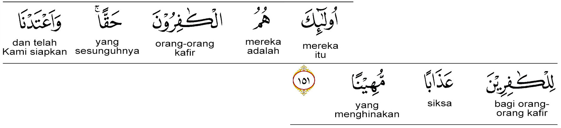 Kemenag RI 2019:merekalah orang-orang kafir yang sebenarnya. Kami telah menyediakan untuk orang-orang kafir azab yang menghinakan. Prof. Quraish Shihab:mereka itulah orang-orang kafir sebenar-benarnya. Kami telah menyediakan untuk orang-orang kafir azab yang menghinakan. Prof. HAMKA:Itulah orang-orang yang sebenarnya kafir. Dan Kami telah sediakan bagi orang-orang yang kafir itu azab yang menghinakan.