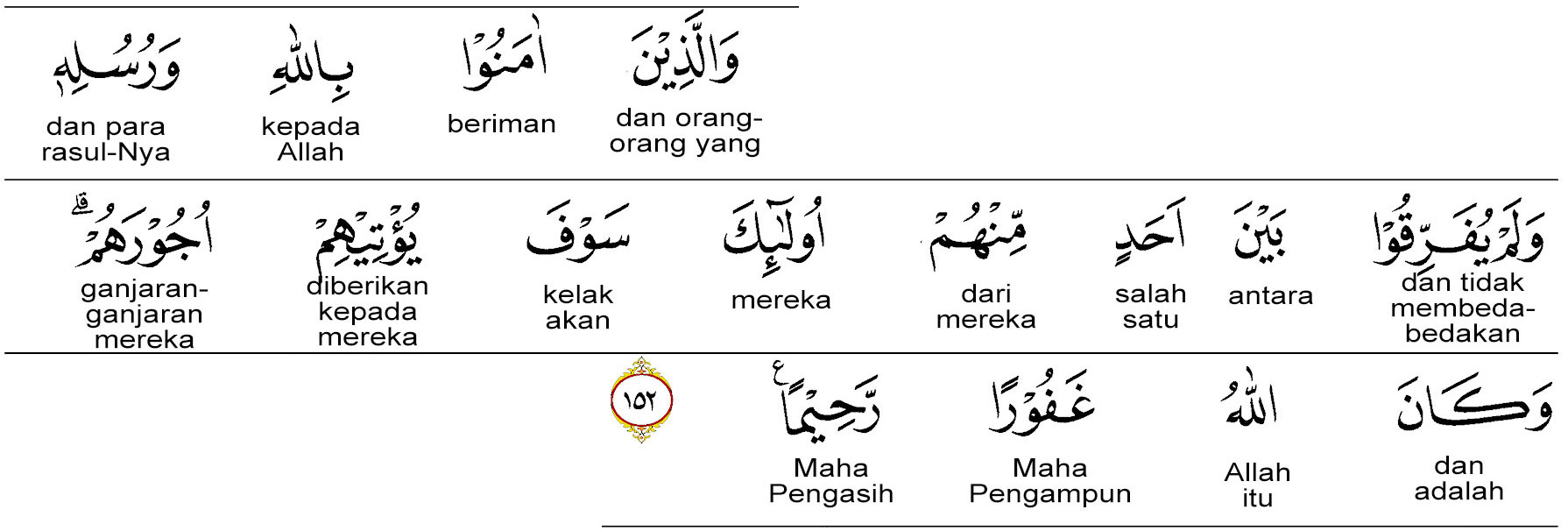 Kemenag RI 2019:Adapun orang-orang yang beriman kepada Allah dan rasul-rasul-Nya dan tidak membeda-bedakan seorang pun di antara mereka (para rasul), kelak Allah akan memberikan pahala kepada mereka. Allah Maha Pengampun lagi Maha Penyayang. Prof. Quraish Shihab:Orang-orang yang beriman kepada Allah dan para rasul-Nya serta tidak membeda-bedakan seorang pun di antara mereka, kelak Allah akan memberikan kepada mereka pahala mereka. Dan Allah Maha Pengampun lagi Maha Pengasih. Prof. HAMKA:Adapun orang-orang yang beriman kepada Allah dan rasul-rasul-Nya, serta tidak memisah-misahkan di antara seorang pun dari mereka, akan diberikan kepada mereka ganjaran mereka. Dan Allah Maha Pengampun lagi Maha Penyayang.