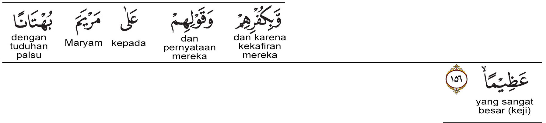 Kata wa qaulihim ‘ala (وَقَوْلِهِمْ) artinya : dan perkataan mereka terkait. Sebenarnya bukan perkataan, melainkan lebih tepatnya tuduhan. Kata nanti diteruskan dengan ungkapan buhtanan.