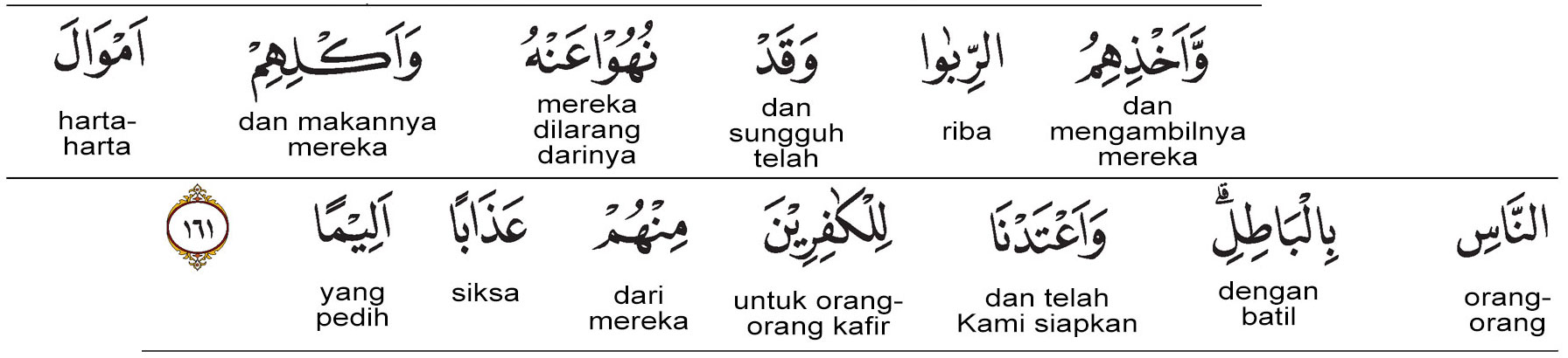 Kata wa akhdzi-him (وَأَخْذِهِمُ) artinya : dan pengambilan mereka. Kata ar-riba (الرِّبَا) artinya : riba.