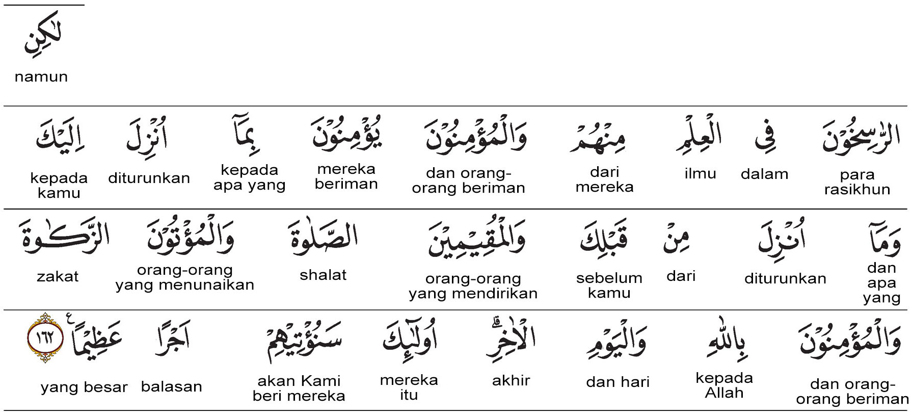 Kemenag RI 2019:Akan tetapi, orang-orang yang ilmunya mendalam di antara mereka dan orang-orang mukmin beriman pada (Al-Qur’an) yang diturunkan kepadamu (Nabi Muhammad) dan pada (kitab-kitab) yang diturunkan sebelummu. (Begitu pula) mereka yang melaksanakan salat, yang menunaikan zakat, dan yang beriman kepada Allah serta hari Akhir. Kepada mereka akan Kami berikan pahala yang besar. Prof. Quraish Shihab:Tetapi orang-orang yang mantap dalam ilmu di antara mereka, dan orang-orang yang beriman, mereka percaya kepada apa yang telah diturunkan kepadamu (Nabi Muhammad ) dan apa yang telah diturunkan sebelum kamu (Taurat, Injil, dan Zabur). Mereka juga melaksanakan shalat, menunaikan zakat, dan beriman kepada Allah serta Hari Akhir. Mereka itulah yang akan Kami anugerahi pahala yang sangat besar.