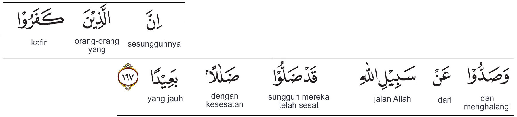 Kemenag RI 2019:Sesungguhnya orang-orang yang kufur dan menghalang-halangi (orang lain) dari jalan Allah, benar-benar telah tersesat jauh. Prof. Quraish Shihab:Sesungguhnya orang-orang kafir dan menghalang-halangi orang lain dari jalan Allah, mereka sungguh telah tersesat dalam kesesatan yang jauh. Prof. HAMKA:Sesungguhnya orang-orang yang kafir dan berpaling dari jalan Allah, mereka benar-benar telah sesat, sesat yang sangat jauh.