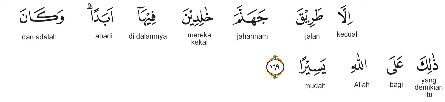 Kemenag RI 2019:kecuali jalan ke (neraka) Jahanam. Mereka kekal di dalamnya selama-lamanya. Hal itu bagi Allah (sangat) mudah. Prof. Quraish Shihab:Kecuali ke jalan menuju (neraka) Jahannam; mereka kekal di dalamnya selama-lamanya. Dan yang demikian itu adalah mudah bagi Allah. Prof. HAMKA: Kecuali jalan ke Jahannam, mereka kekal di dalamnya selama-lamanya. Dan hal tersebut adalah mudah bagi Allah.