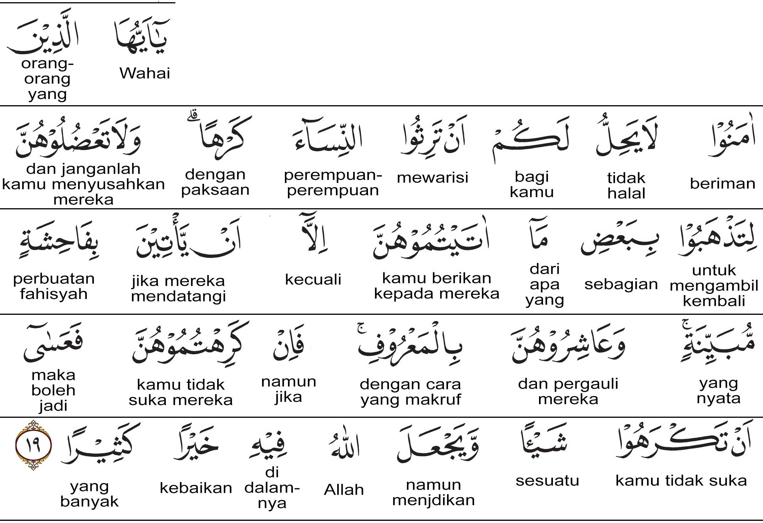 Hai orang-orang yang beriman! Tidak halal bagi kamu mewarisi (harta atau diri) wanita dengan jalan paksa dan janganlah kamu menyusahkan mereka¹¹? karena (kamu) hendak mengambil kembali sebagian dari apa yang telah kamu berikan kepadanya (berupa maskawin atau mengambil warisan dari bekas suaminya), kecuali apabila mereka melakukan perbuatan keji yang nyata (maka kamu boleh mengambil sebagian dari harta itu dengan menuntut cerai). Dan bergaullah dengan mereka secara ma’ruf (patut). Selanjutnya, apabila kamu tidak menyukai mereka, (maka bersabarlah dan jangan terburu-buru menceraikannya) karena boleh jadi kamu tidak menyukai sesuatu, padahal Allah menjadikan padanya kebaikan yang banyak.