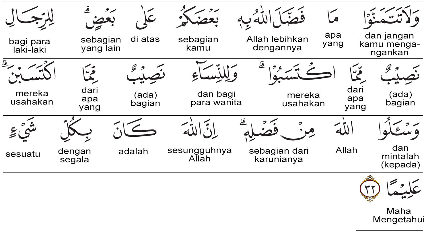 Dan janganlah kamu berangan-angan (yang menghasilkan ketamakan) terhadap apa yang dikaruniakan Allah kepada sebagian kamu (yang kualitasnya lebih baik atau jumlahnya) lebih banyak dari (apa yang dianugerahkan-Nya kepada) sebagian yang lain. Bagi laki-laki ada bagian dari apa yang mereka usahakan, dan bagi wanita-wanita (pun) ada bagian dari apa yang mereka usahakan, dan mohonlah kepada Allah sebagian dari karunia-Nya. Sesungguhnya Allah adalah Maha Mengetahui segala sesuatu.