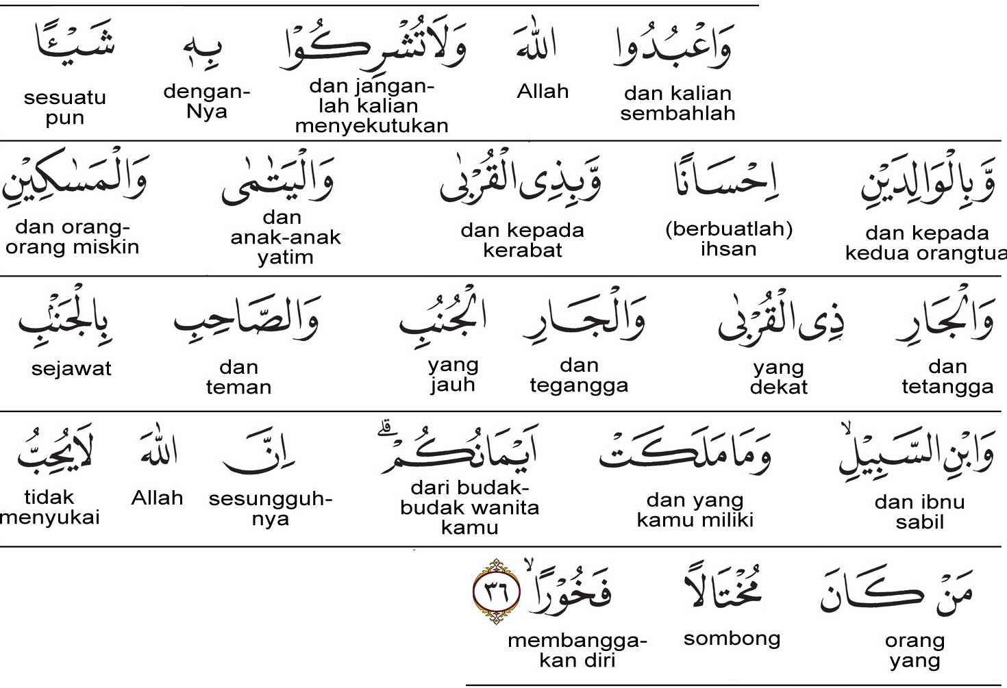 وَاعْبُدُوا اللَّهَ وَلَا تُشْرِكُوا بِهِ شَيْئًا ۖ وَبِالْوَالِدَيْنِ إِحْسَانًا وَبِذِي الْقُرْبَىٰ وَالْيَتَامَىٰ وَالْمَسَاكِينِ وَالْجَارِ ذِي الْقُرْبَىٰ وَالْجَارِ الْجُنُبِ وَالصَّاحِبِ بِالْجَنْبِ وَابْنِ السَّبِيلِ وَمَا مَلَكَتْ أَيْمَانُكُمْ ۗ إِنَّ اللَّهَ لَا يُحِبُّ مَنْ كَانَ مُخْتَالًا فَخُورًا