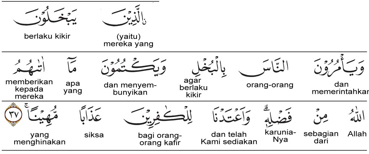 Kemenag RI 2019:(Yaitu) orang-orang yang kikir, menyuruh orang (lain) berbuat kikir, dan menyembunyikan karunia yang telah dianugerahkan Allah kepada mereka. Kami telah menyediakan untuk orang-orang kafir itu azab yang menghinakan. Prof. Quraish Shihab: