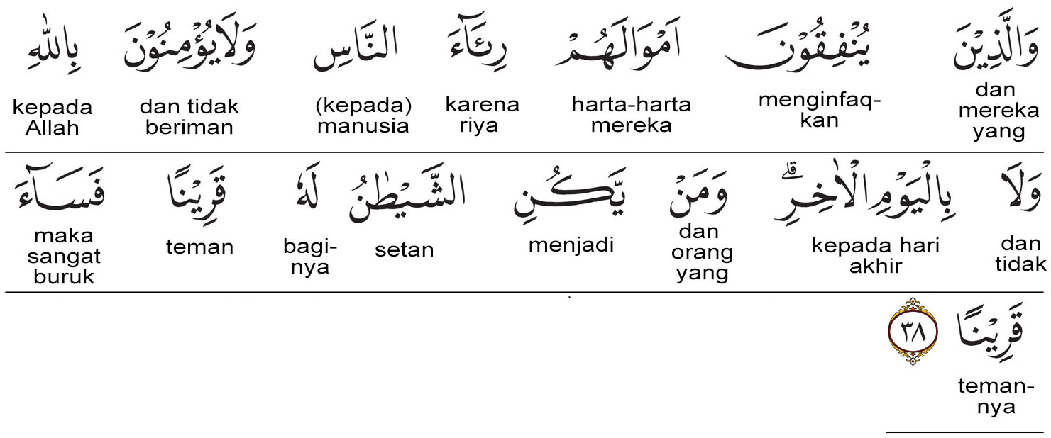 Prof. Quraish Shihab: Dan (juga) orang-orang yang menafkahkan harta mereka karena riya kepada manusia, dan orang-orang yang tidak beriman kepada Allah dan tidak (pula) kepada Hari Kemudian. Barang siapa menjadikan setan sebagai temannya, maka ia (setan) adalah seburuk-buruk teman.