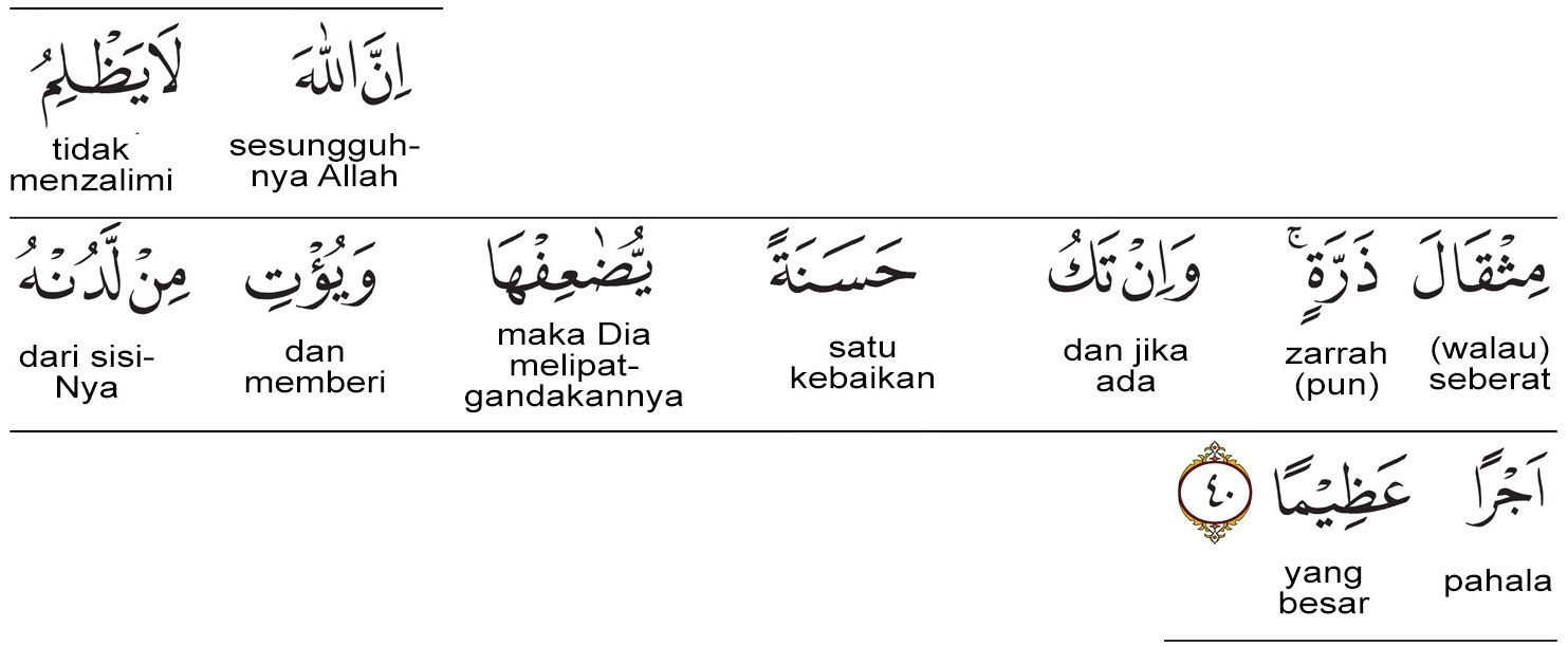 Sesungguhnya Allah tidak menganiaya (seseorang walaupun) sebesar zarrah,¹- dan jika ada kebajikan sebesar zarrah, pasri Dia .ikan melipatgandakannya dan memberikan pahala yang sangat besar dari sisi-Nya.