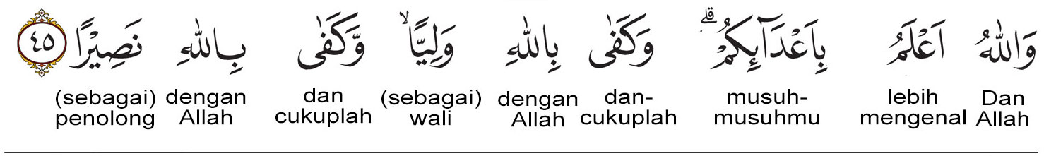 Dan Allah lebih mengetahui (daripada kamu) tentang para musuh kamu. Dan cukuplah Allah sebagai Pelindung dan cukuplah .Allah sebagai Penolong.