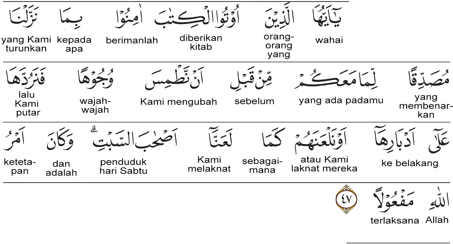 Hai orang-orang yang sudah diberi al-kitan! Berimanlah kamu kepada apa yang telah Kami turunkan (Al-Quran) yang membenarkan apa (kitab) yang ada pada kamu sebelum Kami mengubah wajah-wajah (kamu), lalu Kami putar ke belakang atau Kami melaknat mereka sebagaimana Kami telah melaknat orang-orang (yang berbuat maksiat) pada hari Sabtu. DAn adalah ketetapan Allah (pasti) berlalu.