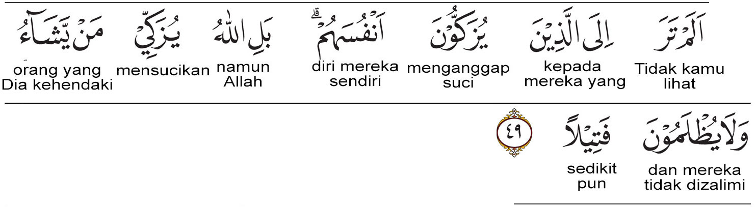 Maka jika kita gabungkan penggalan ini dengan penggalan sebelumnya menjadi (أَلَم تَرَ إِلَى ٱلَّذِینَ یُزَكُّونَ أَنفُسَهُم), maka maksudnya menjadi :