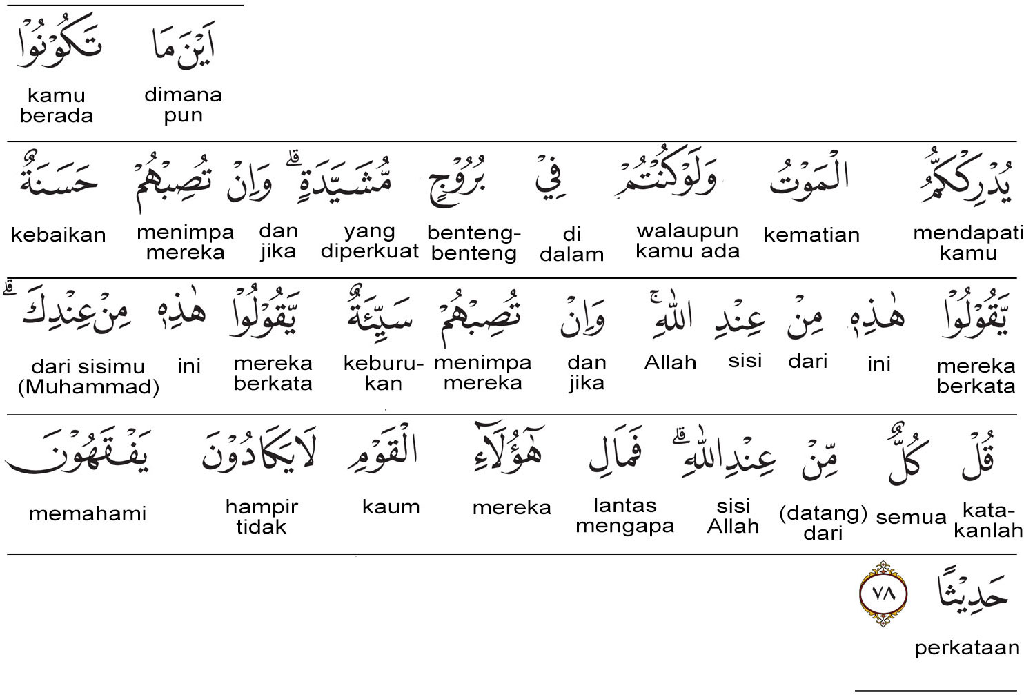 Kemenag RI 2019:Di mana pun kamu berada, kematian akan mendatangimu, meskipun kamu berada dalam benteng yang kukuh. Jika mereka (orang-orang munafik) memperoleh suatu kebaikan, mereka berkata, “Ini dari sisi Allah” dan jika mereka ditimpa suatu keburukan, mereka berkata, “Ini dari engkau (Nabi Muhammad).” Katakanlah, “Semuanya (datang) dari sisi Allah.” Mengapa orang-orang itu hampir tidak memahami pembicaraan? Prof. Quraish Shihab:Di mana saja kamu berada, kematian akan mendapatkan kamu, meskipun kamu berada di dalam benteng-benteng yang tinggi lagi kokoh. Dan jika mereka (orang-orang munafik) memperoleh kebaikan, mereka mengatakan: “Ini dari sisi Allah,” dan jika mereka ditimpa bencana, mereka mengatakan: “Ini dari engkau (Nabi Muhammad saw.).” Katakanlah: “Semuanya dari sisi Allah.” Maka mengapa orang-orang itu hampir saja tidak memahami pembicaraan? Prof. HAMKA:Di mana saja kamu berada, kematian akan menemukan kamu, meskipun kamu berada di dalam benteng yang kokoh. Jika mereka memperoleh kebaikan, mereka berkata, “Ini adalah dari sisi Allah,” tetapi jika mereka ditimpa kesulitan, mereka berkata, “Ini adalah dari sisi engkau.” Katakanlah, “Semua itu dari sisi Allah.” Mengapa kaum itu hampir-hampir tidak memahami perkataan?