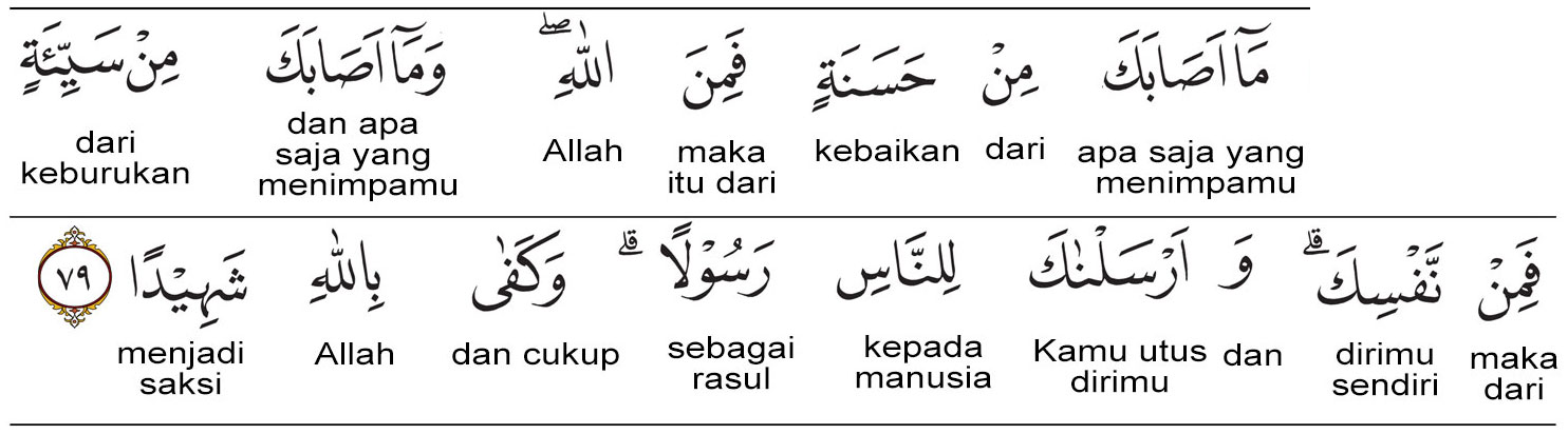 Kemenag RI 2019:Kebaikan (nikmat) apa pun yang kamu peroleh (berasal) dari Allah, sedangkan keburukan (bencana) apa pun yang menimpamu itu disebabkan oleh (kesalahan) dirimu sendiri. Kami mengutus engkau (Nabi Muhammad) menjadi Rasul kepada (seluruh) manusia. Cukuplah Allah sebagai saksi. Prof. Quraish Shihab:Apa saja nikmat yang engkau peroleh adalah dari Allah, dan apa saja bencana yang menimpamu maka dari (kesalahan) dirimu sendiri. Kami telah mengutusmu (Nabi Muhammad saw.) menjadi rasul kepada seluruh manusia. Dan cukuplah Allah menjadi Saksi.