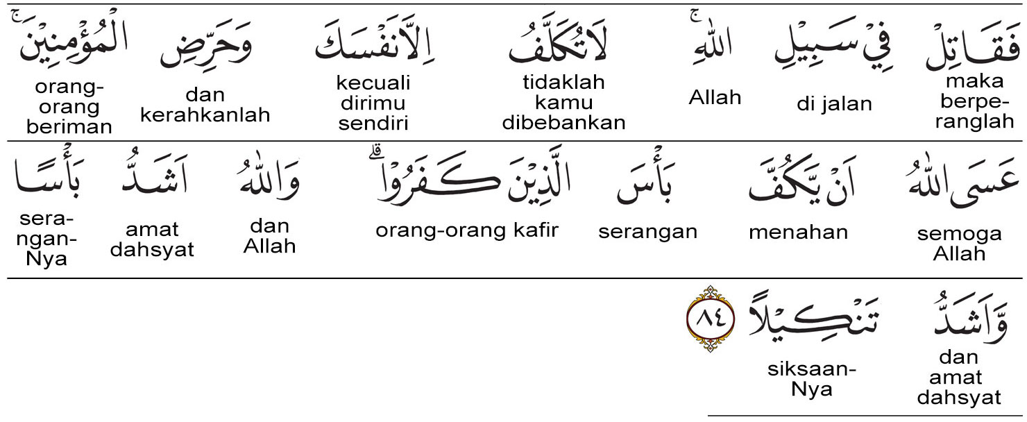 Kemenag RI 2019:Maka, berperanglah engkau (Nabi Muhammad) di jalan Allah. Tidaklah engkau dibebani (tanggung jawab), kecuali (yang terkait) dengan dirimu sendiri. Kobarkanlah (semangat) orang-orang mukmin (untuk berperang). Semoga Allah menolak serangan orang-orang yang kufur itu. Allah sangat dahsyat kekuatan-Nya dan sangat keras siksaan-Nya. Prof. Quraish Shihab:Maka, berperanglah engkau (Nabi Muhammad SAW) pada jalan Allah, tidaklah engkau dibebani melainkan dengan kewajibanmu sendiri. Kobarkanlah semangat orang-orang mukmin. Mudah-mudahan Allah menolak serangan orang-orang yang kafir. Allah sangat besar kekuatan-Nya dan sangat keras siksa-Nya. Prof. HAMKA:Maka berperanglah di jalan Allah; kamu tidak dibebani melainkan dengan kewajibanmu sendiri. Kerahkanlah orang-orang yang beriman. Mudah-mudahan Allah akan menahan kekuatan orang-orang kafir itu. Allah Maha Kuat dan Maha Pedih siksa-Nya.